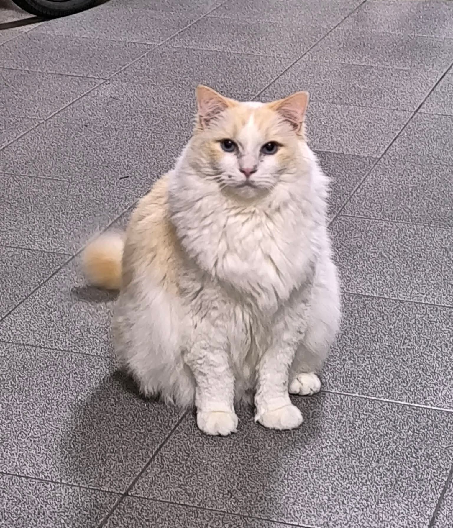 É um gato branco e amarelo. Tem chip e é muito dócil.