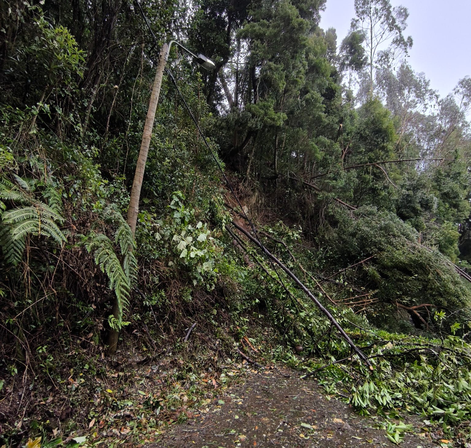Sítio isolado no Santo da Serra, palmeira parte e cai em edifício e queda de vedação da Zona Franca fecha estrada